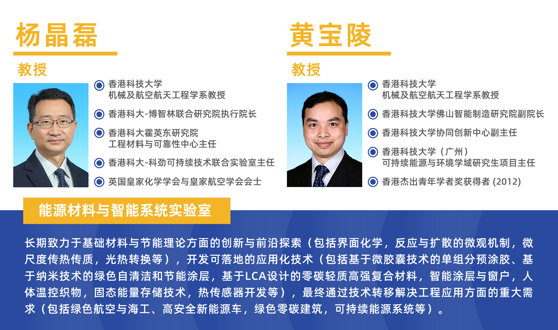 能源材料与智能系统实验室由杨晶磊教授与黄宝陵教授联合牵头负责,长期致力于基础材料与节能理论方面的创新与前沿探索(包括界面化学,反应与扩散的微观机制,微尺度传热传质,光热转换等),开发可落地的应用化技术(包括基于微胶囊技术的单组分预涂胶、基于纳米技术的绿色自清洁和节能涂层,基于LCA设计的零碳轻质高强复合材料,智能涂层与窗户,人体温控织物,固态能量存储技术,热传感器开发等),最终通过技术转移解决工程应用方面的重大需求(包括绿色航空与海工、高安全新能源车,绿色零碳建筑,可持续能源系统等)。