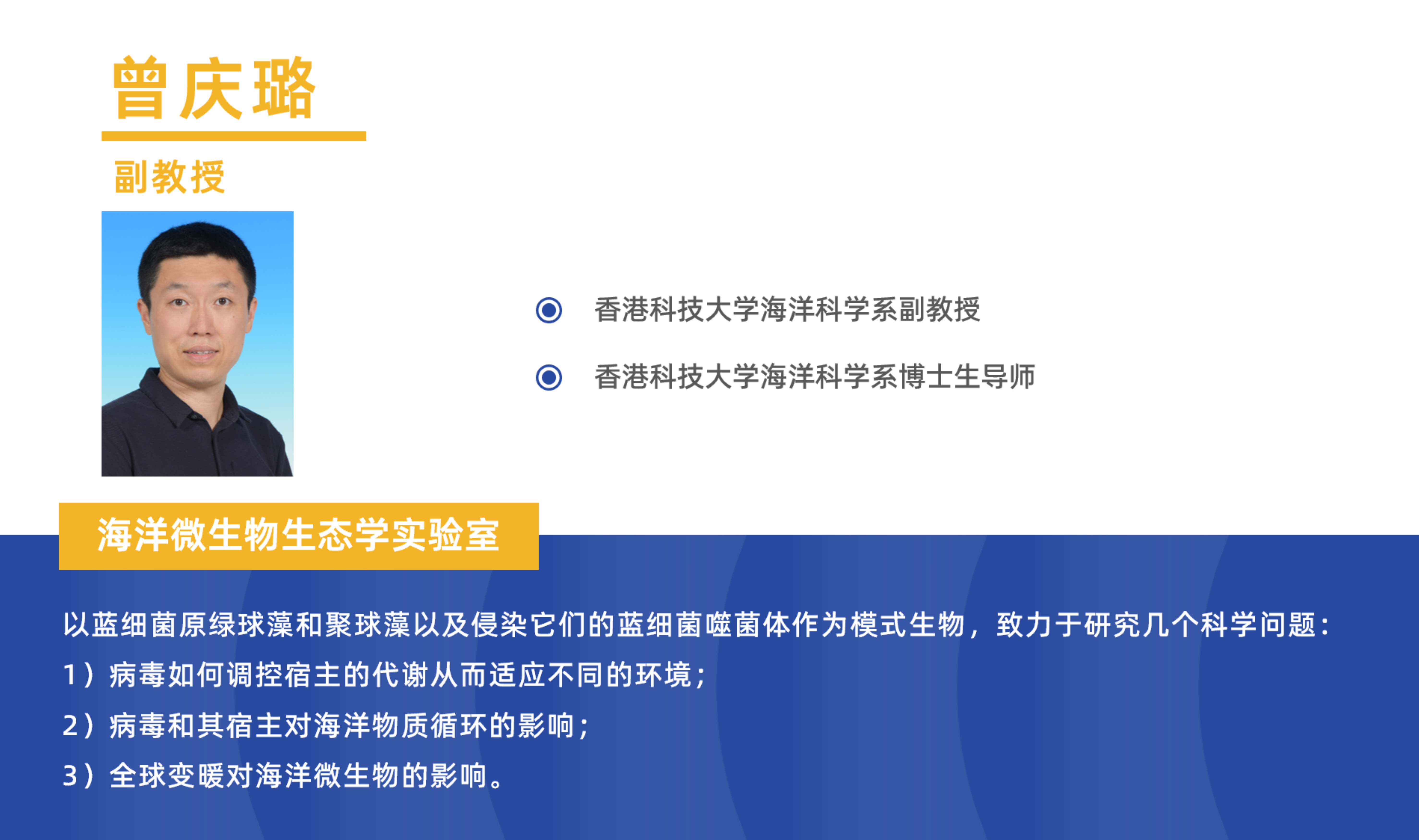 香港科技大学演化与健康中心下设实验室之一。海洋微生物生态学实验室由曾庆璐教授牵头负责,研究海洋微生物的进化过程,关注对海产养殖和人类健康有应用潜力的微生活及其化合物。主要研究海洋中的细菌与其病毒的相互作用、对环境因子的响应机制以及对海洋生态环境的影响。以蓝细菌原绿球藻和聚球藻以及侵染它们的蓝细菌噬菌体作为模式生物,致力于研究几个科学问题:(1)病毒如何调控宿主的代谢从而适应不同的环境;(2)病毒和其宿主对海洋物质循环的影响;(3)全球变暖对海洋微生物的影响。对于这些科学问题的研究,将有助于利用海洋微生物发展节能减排和生产可再生能源的新方法。