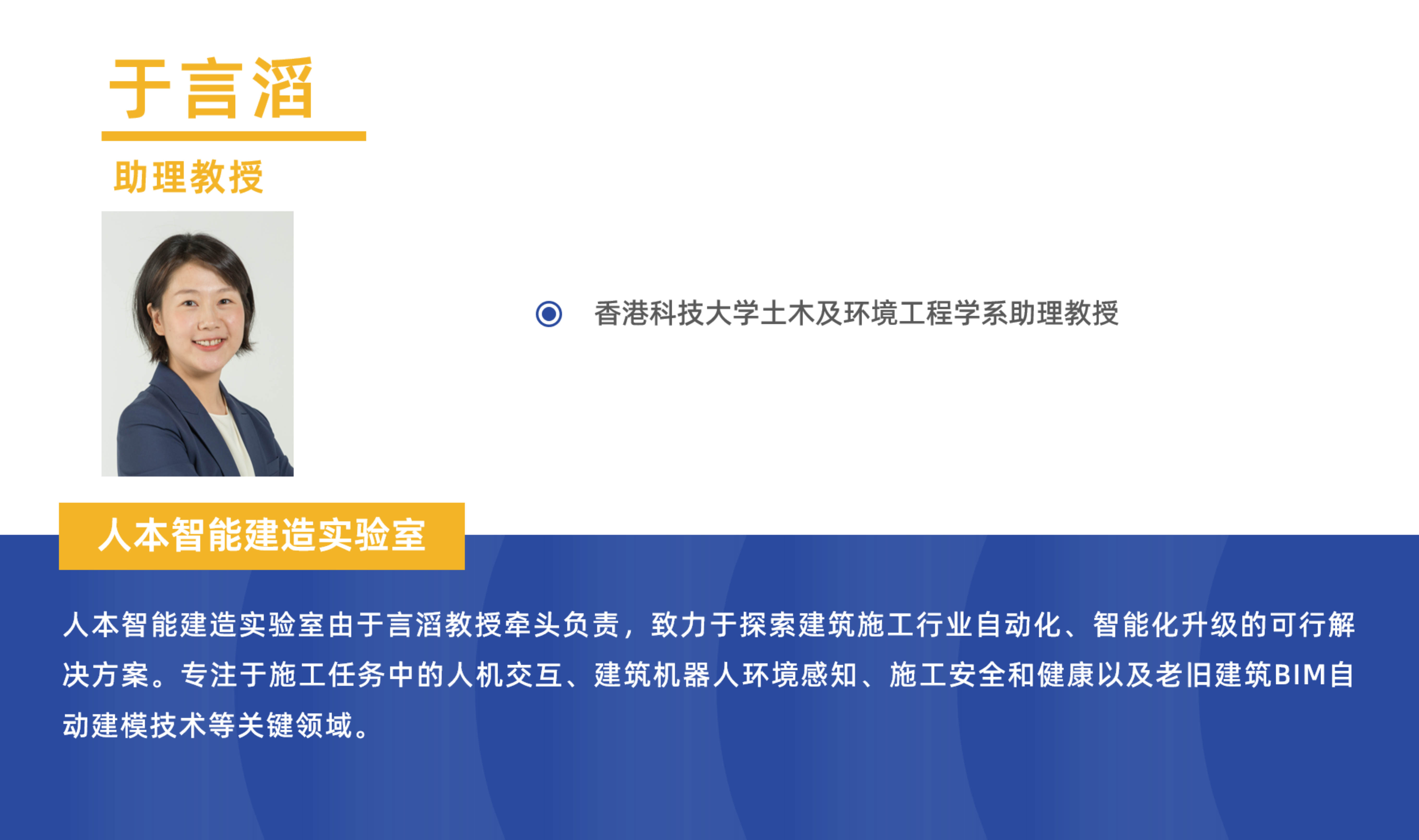 人本智能建造实验室由于言滔教授牵头负责,致力于探索建筑施工行业自动化、智能化升级的可行解决方案。实验室专注于以下关键领域: (1)施工任务中的人机交互,基于多模态融合的环境感知、协作任务的数学建模以及工人-机器人协作工作流程设计,促进施工任务中工人-机器人的顺利协作,减轻工人的劳动负担,提升施工效率和生产力。 (2)建筑机器人环境感知,旨在解决建筑机器人在动态、变光照和低纹理环境中的定位与建图问题,提高机器人在实际施工现场的可应用性。 (3)施工安全和健康,旨在设计人体生理、心理数据收集方法,用于建筑工人个体的安全健康风险分析,辅助施工现场安全管理决策。 (4)老旧建筑BIM自动建模技术,训练机器学习模型读取二维图纸的设计信息,生成BIM模型,辅助老旧建筑的运维和改造。