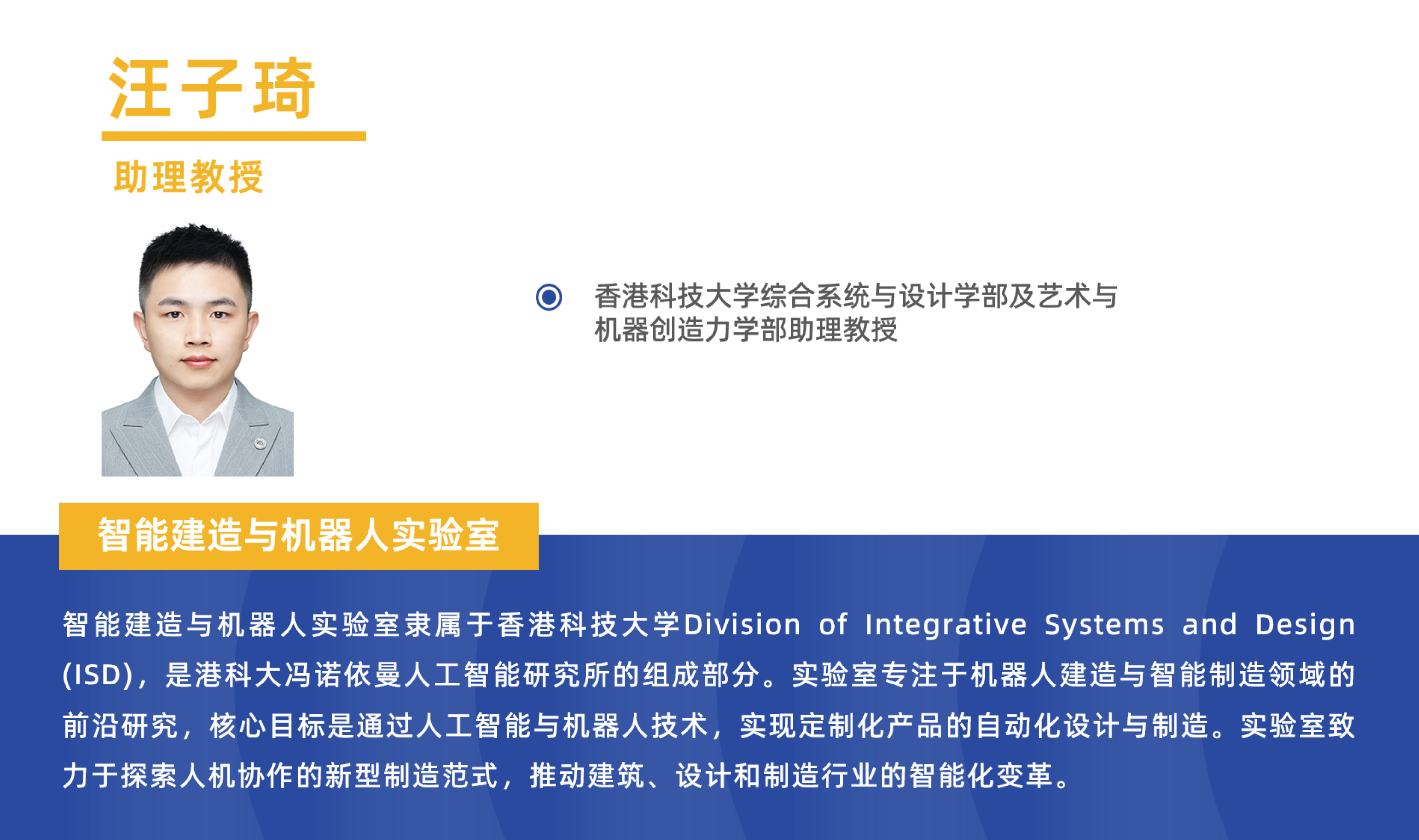 智能建造与机器人实验室隶属于香港科技大学Division of Integrative Systems and Design (ISD),是港科大冯诺依曼人工智能研究所的组成部分。实验室专注于机器人建造与智能制造领域的前沿研究,核心目标是通过人工智能与机器人技术,实现定制化产品的自动化设计与制造。实验室致力于探索人机协作的新型制造范式,推动建筑、设计和制造行业的智能化变革。