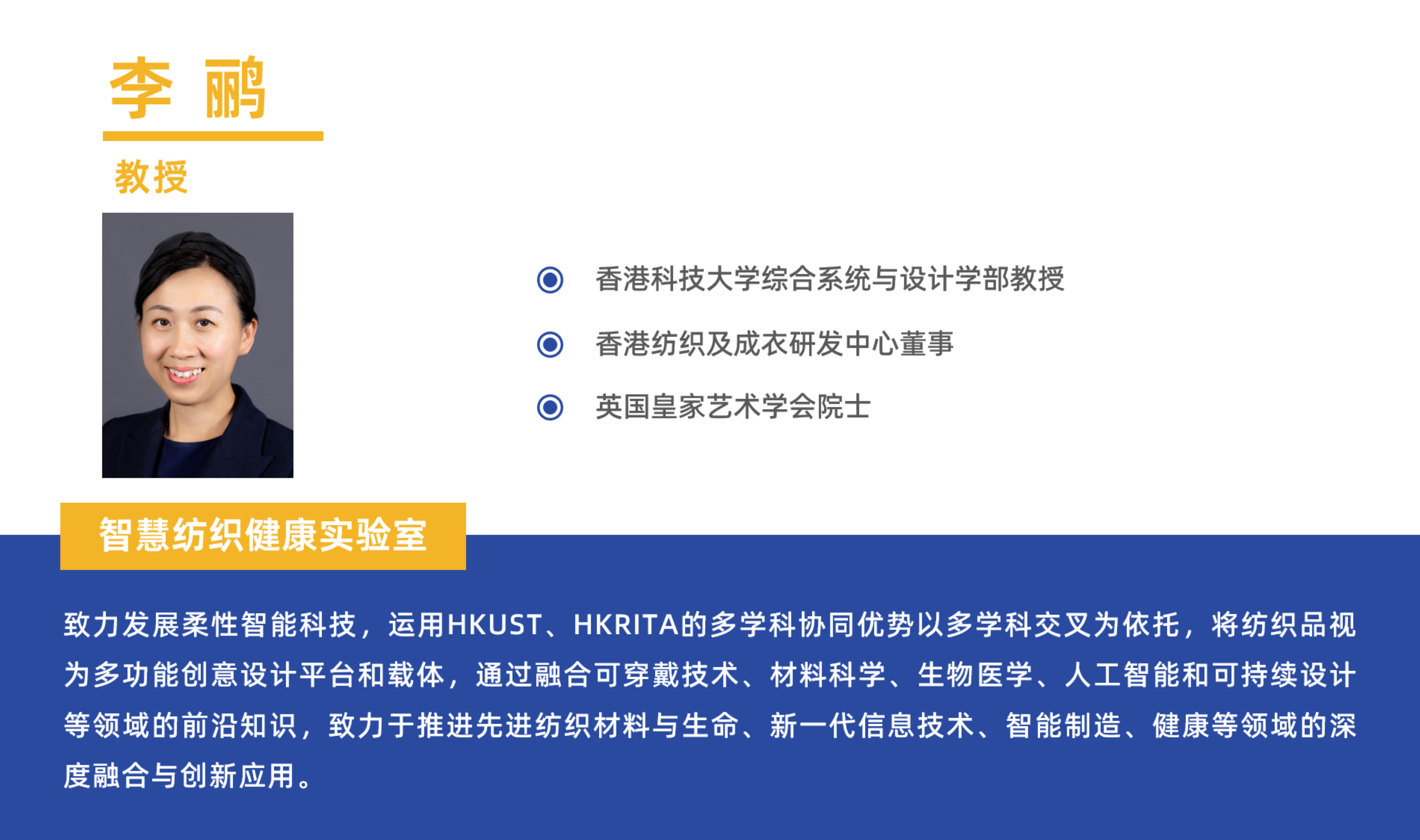 实验室致力发展柔性智能科技,运用HKUST、HKRITA的多学科协同优势以多学科交叉为依托,将纺织品视为多功能创意设计平台和载体,通过融合可穿戴技术、材料科学、生物医学、人工智能和可持续设计等领域的前沿知识,致力于推进先进纺织材料与生命、新一代信息技术、智能制造、健康等领域的深度融合与创新应用。主要研究方向包括新型柔性纤维先进制造科学与技术、多功能柔性电子器件的结构设计与成形技术、功能智能柔性材料/系统在大健康领域的创新应用、数字化转型及其可持续发展等。
